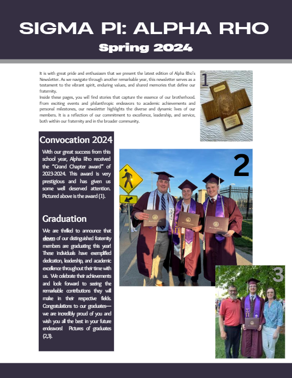 As valued members of the Sigma Pi Alpha Rho Alumni, we are pleased to share the latest updates and highlights from our recent newsletters. These communications reflect our ongoing commitment to fostering brotherhood, supporting personal growth, and advancing the legacy of our chapter. You will find news on alumni events, chapter achievements, and opportunities to stay connected with fellow brothers as we continue to build a strong and vibrant Sigma Pi community. We hope you enjoy these newsletters and we welcome your comments and feedback.
